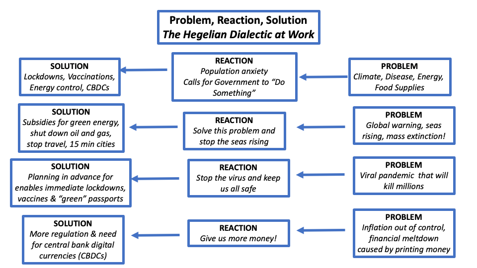 A number of commentators have written about the strategy behind the crises we have been experiencing as the Hegelian Dialectic – Problem, Reaction, Solution. Most recently I read a good article by James Corbett – on the controlled demolition of the US economy, highlighting the Hegelian philosophy and I recommend that my readers read the Corbett article. I have attempted to show this Problem, Reaction, Solution concept in a simple diagram below and have provided a summary from The Truthers Journal – from an article published in early 2020. In this article The Problem, Reaction, Solution Paradigm is described as follows: