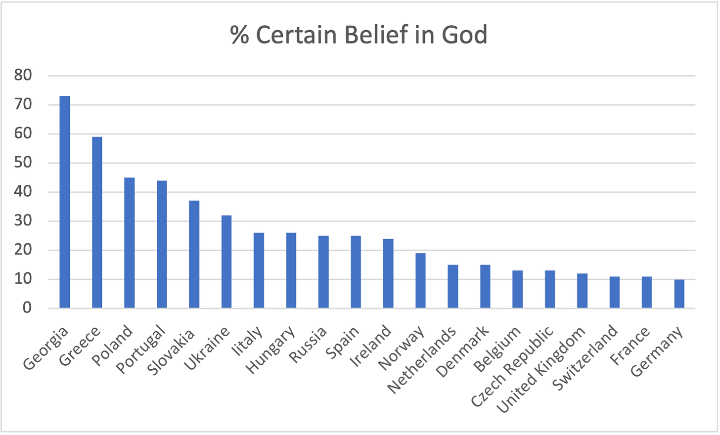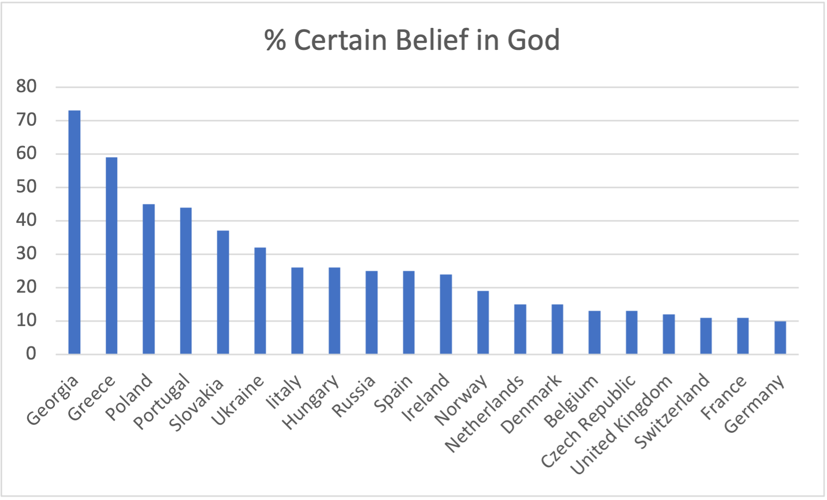 Data from Pew Research Center - % of Population who Believe in God with Certainty